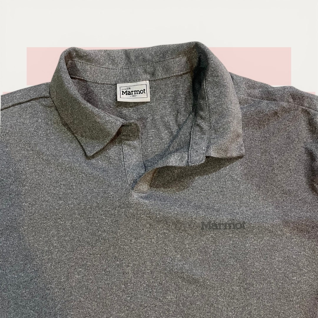 Marmot polo shirt, charcoal solid polo, outdoor polo men, rugged polo shirt, performance polo thrift, thrifted Marmot, sustainable outdoor wear, smart casual polo, grey polo shirt, authentic Marmot thrift