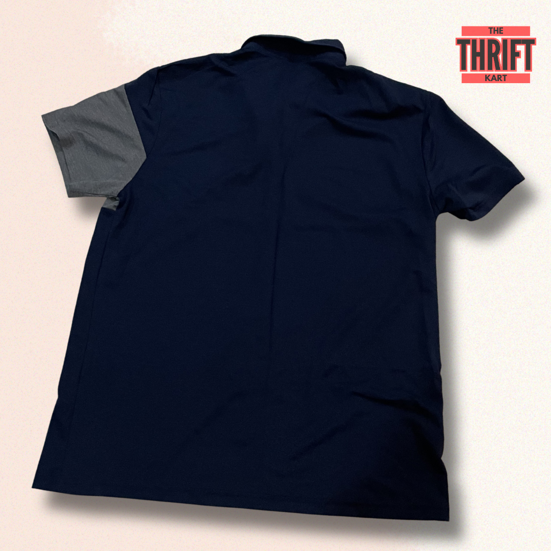 - Classic polo collar with modern navy and grey color-block design for contemporary athletic styling